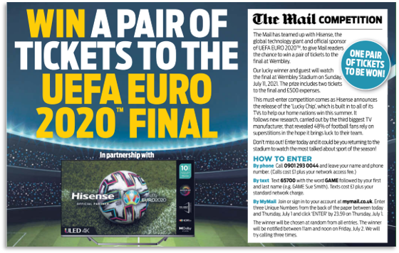 By offering just one pair of tickets to the EURO 2020 final, we secured front page national paper presence for Hisense in the Daily Mail, as well as coverage in the Mail Online, the i paper and i News online – a combined reach of almost 90 million. Score. Not only did this include the ticket comp, but the content also included images of Hisense’s hero EURO 2020 TV and a news story  from research we’d completed around fan superstitions to support lucky chip creative campaign profile. So, those people who missed out on the comp win had the Hisense TV front of mind when they were searching for a new screen.