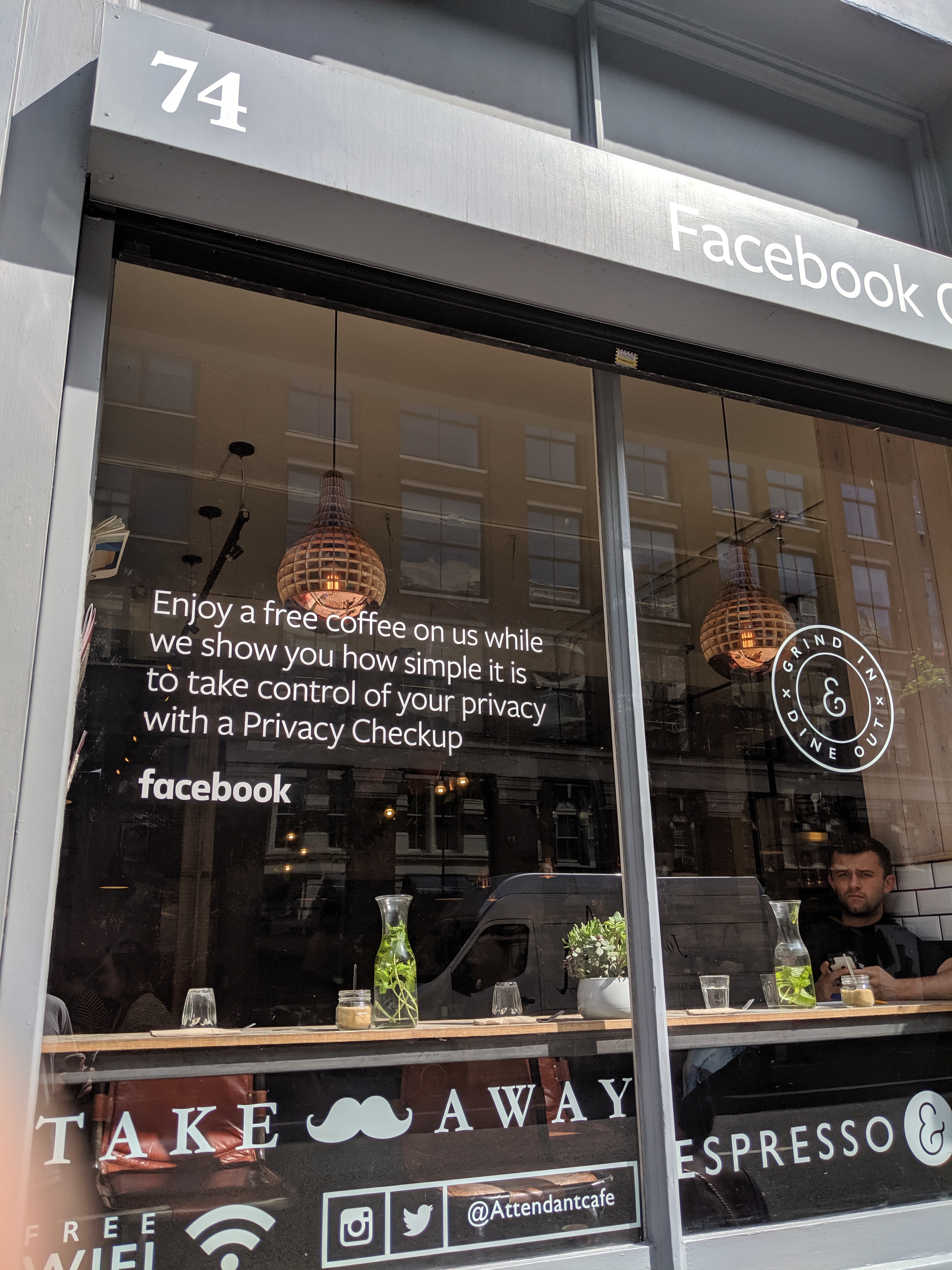 Facebook’s “Privacy Café” is a touring popup which will be stopping off in key cities across the UK to spread the word about Facebook’s Privacy Checkup tool (more about that later). Upon arrival the café was rather low key, with subtle branding on the exterior of the Shoreditch branch of the Attendant. Heading inside, the greeting was warm, and it was explained that all that was required for a free cappuccino was to have a quick chat about Facebook’s new tool, simple. The popup only actually took up a small corner of the café, with regular punters still able to enjoy their drinks in peace, whilst freebie hunters and Facebook privacy super fans could congregate in the corner.